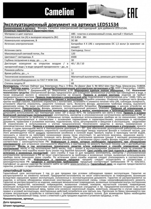 Источники света: 1 x LED SEOUL (производство Южная Корея) с потребляемой мощностью 3 ватта, с цветовой температурой 6000К и максимальным световым потоком 120 люмен
