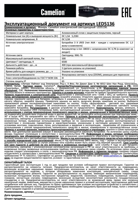 Фонарь ручной Camelion LED5136 черный