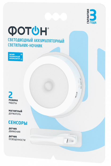 Режимы работы: автоматический и ручной .Сенсоры: датчик освещенности, датчик движения.В автоматическом режиме: включается только в темное время суток при движении в радиусе 3 метров выключается автоматически через 30 секунд.Фронтальное освещение(перед собой). Магнитный держатель.Металлическая пластина с двусторонним скотчем в комплекте.Время работы на одном заряде 3 часа .Питание: литий-полимерный аккумулятор 300мАч.
