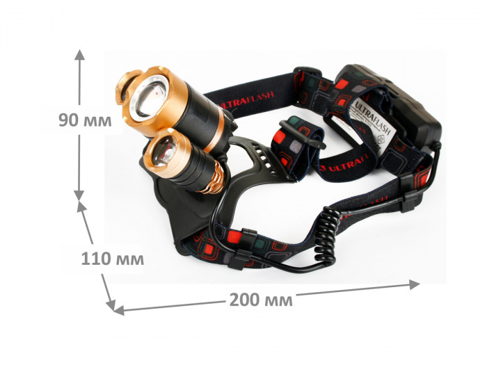 Светодиодный налобный фонарь Ultraflash E1333. Дистанция освещения — до 250 метров. Регулируемый фокус (ZOOM). 4 режима работы: XML-T6 / 2 боковых LED / все LED BOOST / мигалка. Возможность работы и от одного, и от двух аккумуляторов. Возможность работы напрямую от Powerbank через вход Micro USB. Индикатор заряда, меняющий цвет при окончании заряда. Выключатель: четырехпозиционный кнопочный. Время работы при полностью заряженном аккумуляторе (для емкости 1200 мА-ч):: в режиме XML-T6 — до 3,5 часов, в режиме 2 X XPE — до 5,8 часов, все LED — до 2,3 часов, мигающий режим — до 4 часов.
