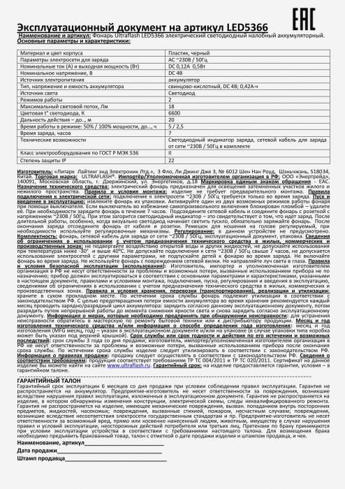 Тех.хар-ки, дополнительные функции - Дистанция освещения — до 20 м, 2 режима работы, время работы — до 5 часов, сетевой кабель 220 вольт для заряда, IP22
