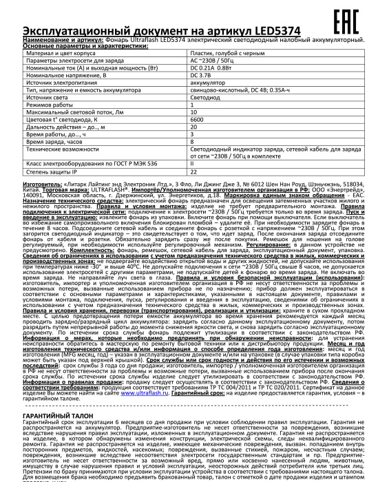 Тех.хар-ки, дополнительные функции - Дистанция освещения — до 20 м, 1 режим работы, время работы — до 3 часов, сетевой кабель 220 вольт для заряда, IP22