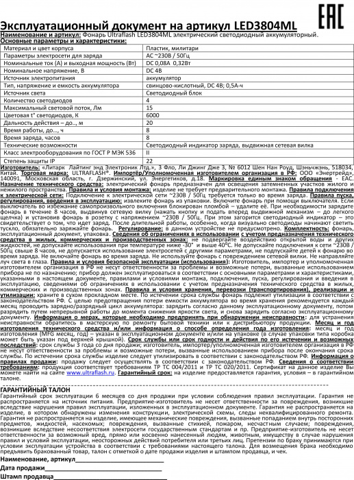 Тех.хар-ки, дополнительные функции - Дистанция освещения — до 20 м, 1 режим работы, время работы — до 8 часов, выдвижная сетевая вилка, IP22