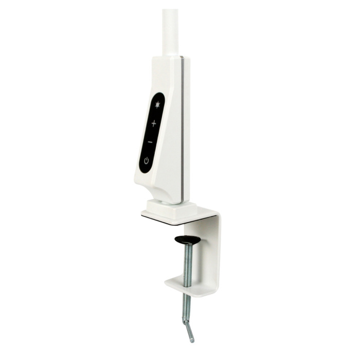 Гибкая металлическая стойка имеет силиконовое покрытие. Мощная металлическая струбцина надежно фиксирует светильник на любой поверхности толщиной до 6,5 см.