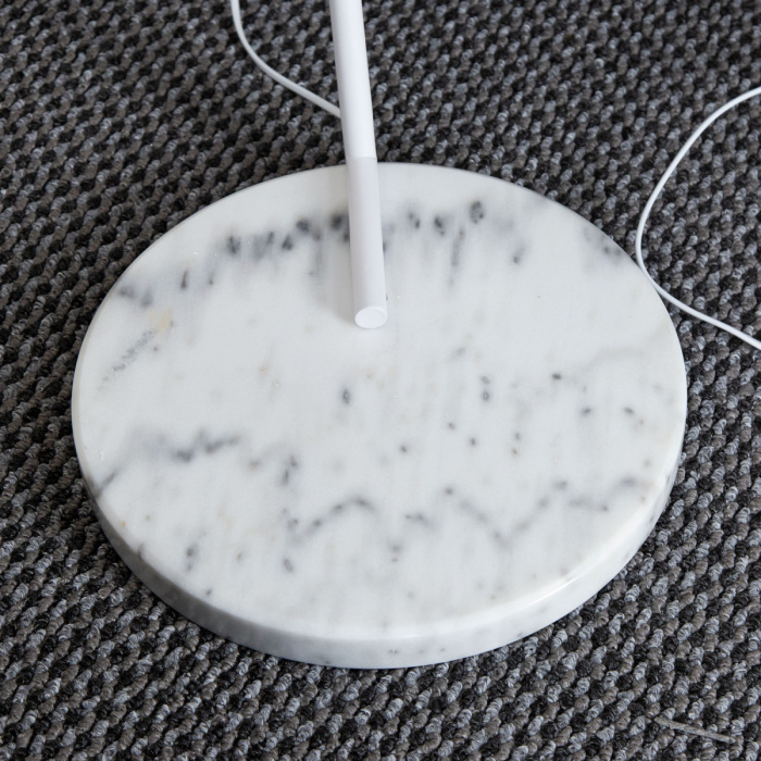 Напольный изогнутый светильник с абажуром выполнен в современном стиле. Основание модели изготовлено из натурального камня белого цвета с естественным рисунком и вкраплениями. Дугообразная стойка торшера металлическая, с регулировкой длины. Абажур тканевый. Сетевой шнур белого цвета, длина 1,8 метра, на нем расположен ножной выключатель. Модель торшера удочки очень устойчивая, отлично подойдет для освещения кресла, дивана или журнального столика в зоне отдыха.